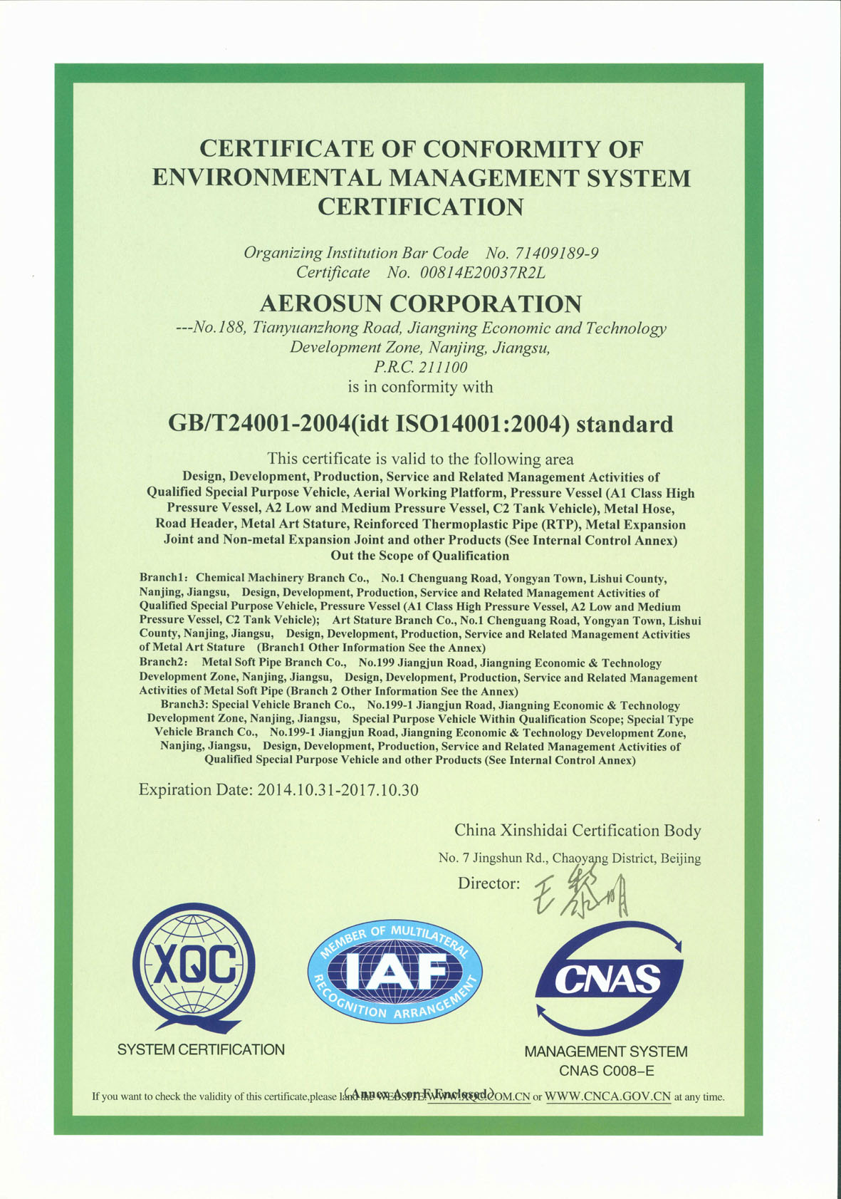 環境管理體系認證證書英文