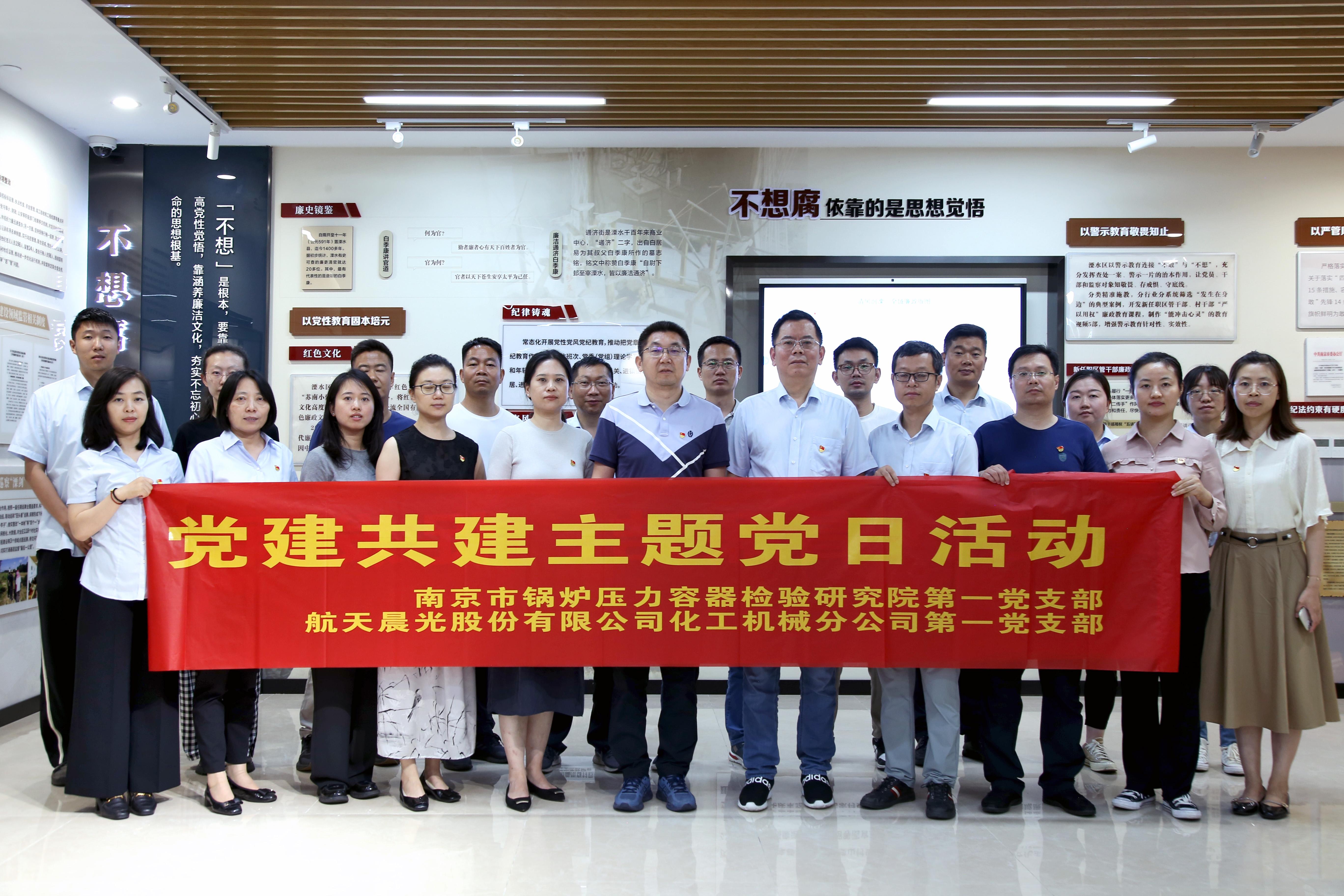近日,航天晨光化機分公司第一黨支部聯(lián)合南京市鍋爐壓力容器檢驗研究院第一黨支部開展“明黨紀、倡廉潔、促發(fā)展”黨建共建活動。分公司黨委書記、副總經(jīng)理儲志軍,黨委副書記、總經(jīng)理毛長鈞,黨委委員、副總經(jīng)理張少勇,第一黨支部全體委員,黨委辦公室人員及部分黨員代表參加了本次活動。